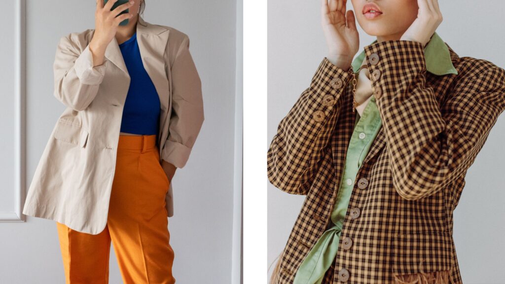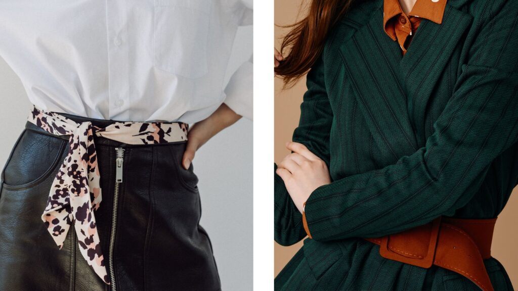 Cinching your waist with belts, scarves or waist-defining garments can create the appearance of more curves and add shape to your figure. It can also help cut the vertical line of your figure helping reduce the illusion of height. Belts are an essential item for tall girls – this is an easy way to introduce verticle lines to break up a tall block of clothing. You can shop sustainably for scarves and belts by browsing eBay, Depop, vintage stores, and designer resellers’ sites.
